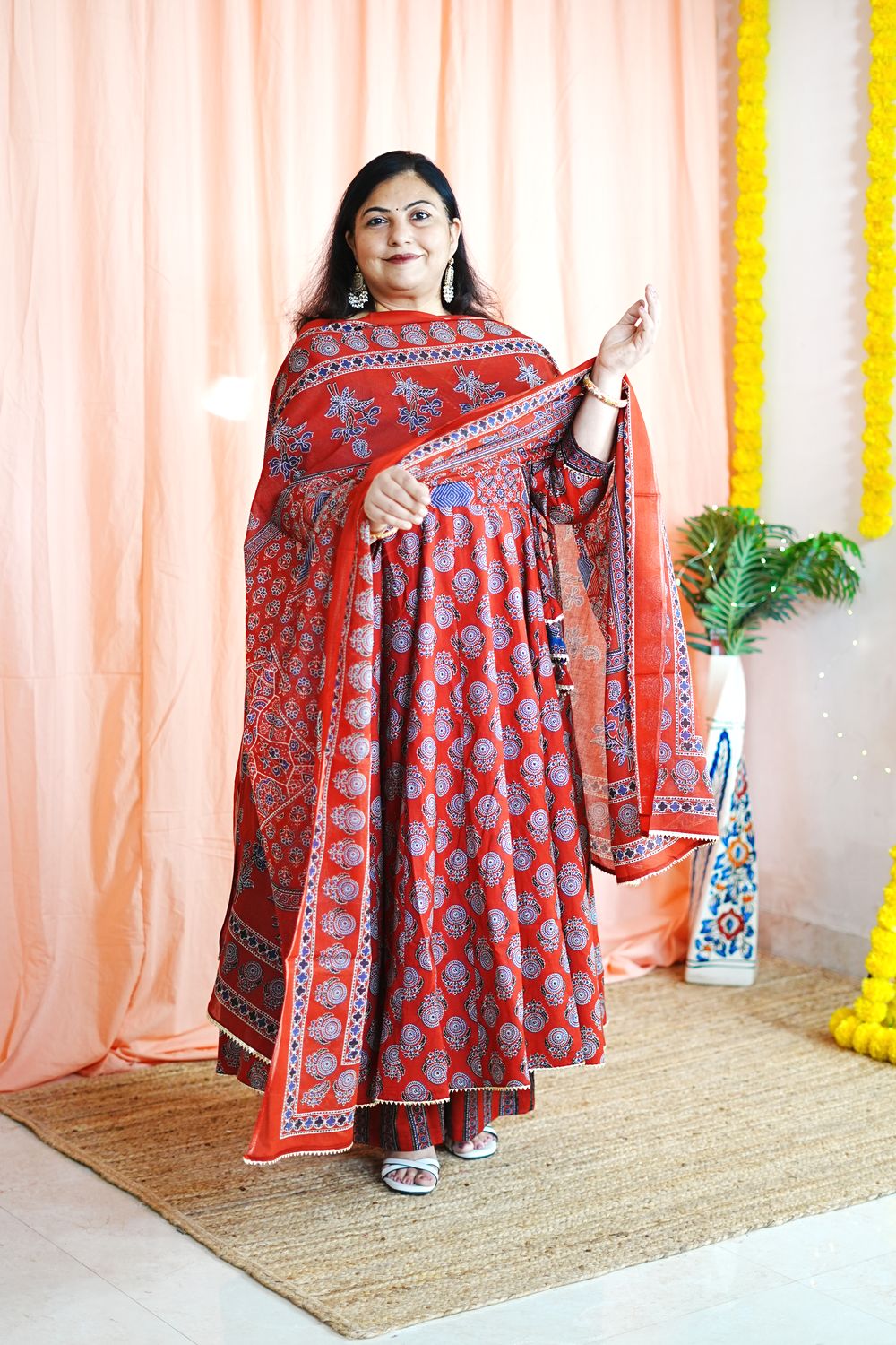 Step into timeless elegance with our Priya Red Plus Size Anarkali, a celebration of traditional Jaipuri craftsmanship and modern plus-size tailoring.