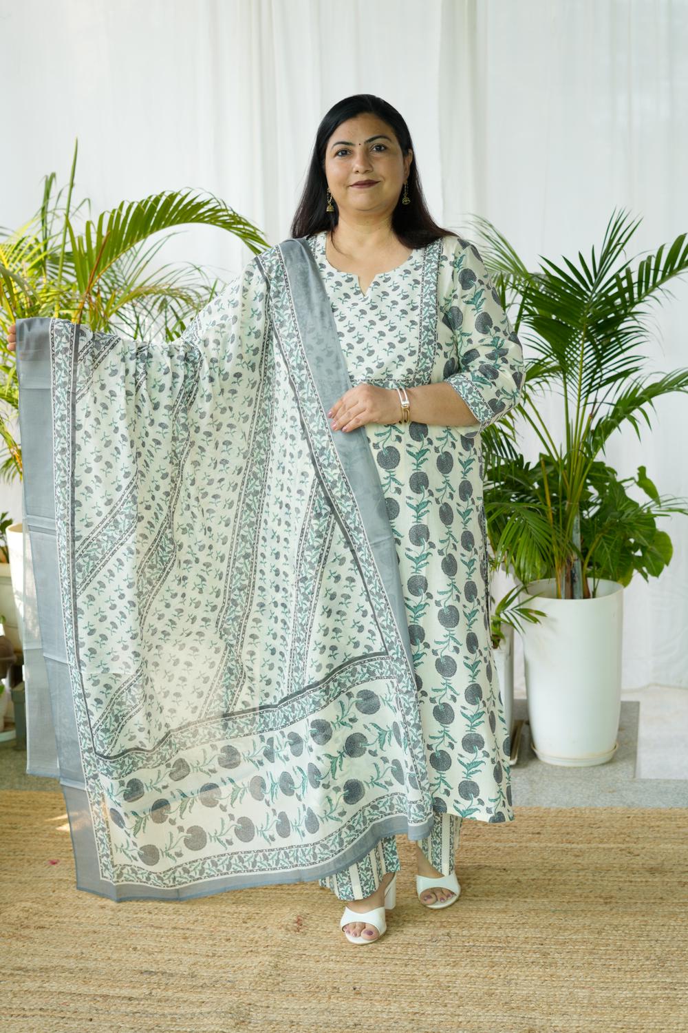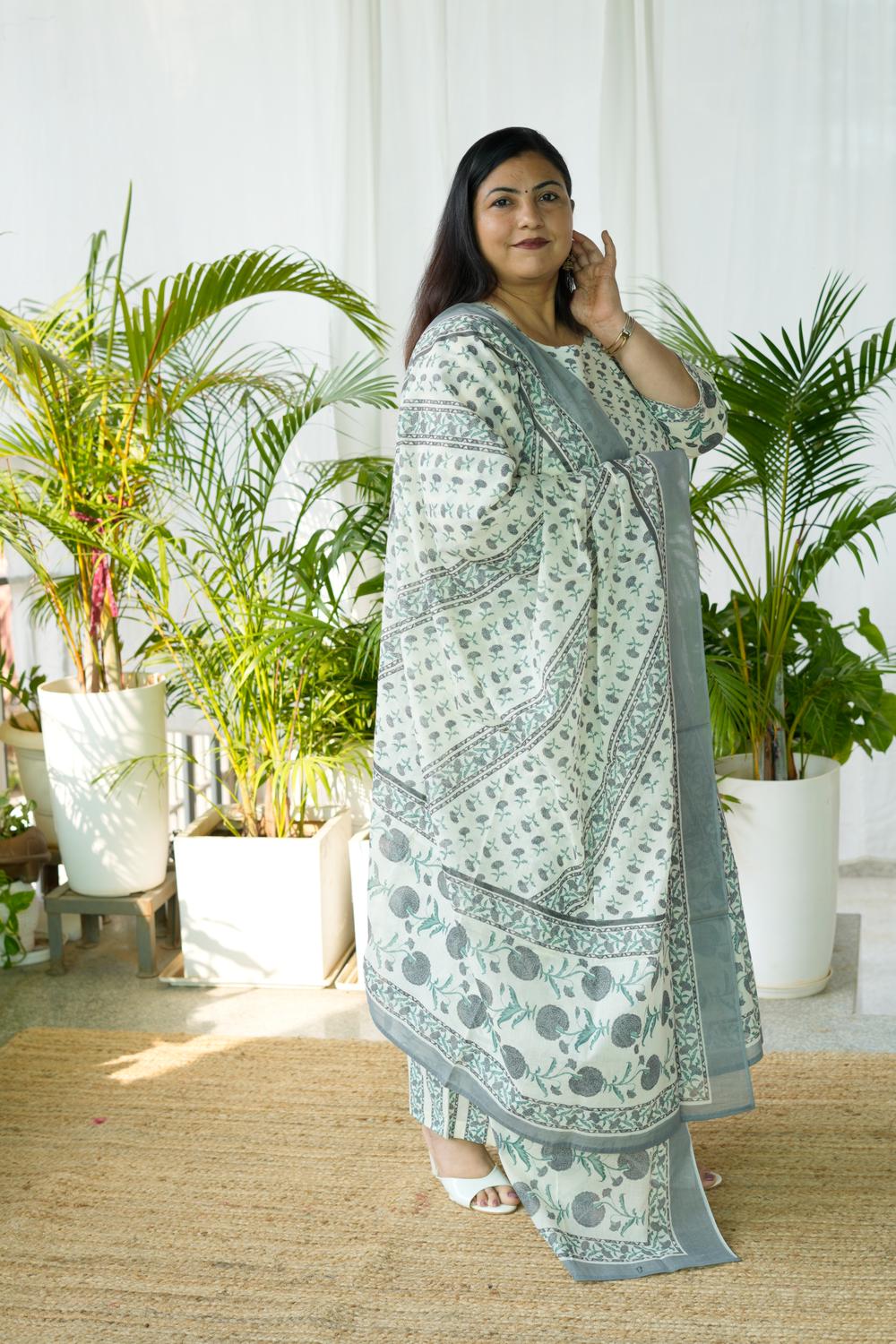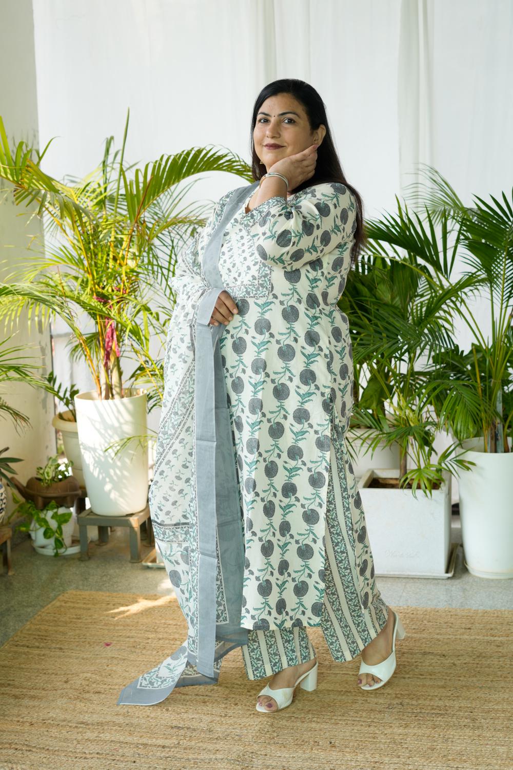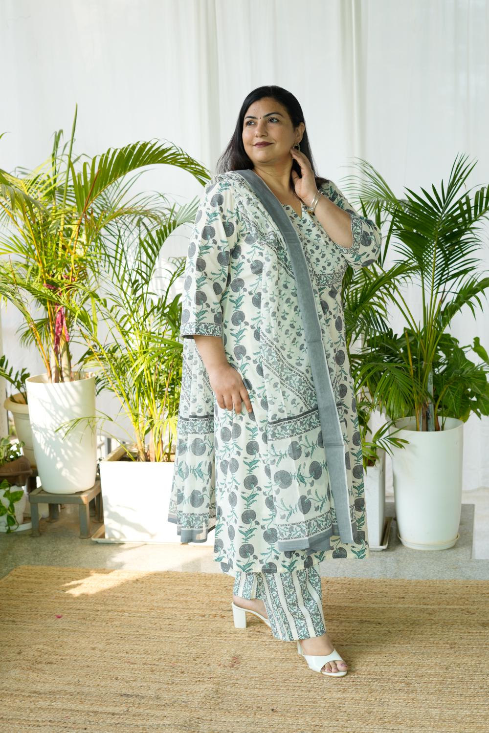 Feel confident, comfortable, and effortlessly elegant in our Grey Sanganeri Butta 3Pcs Set, designed specially for plus-size women (S-36 to 15XL).