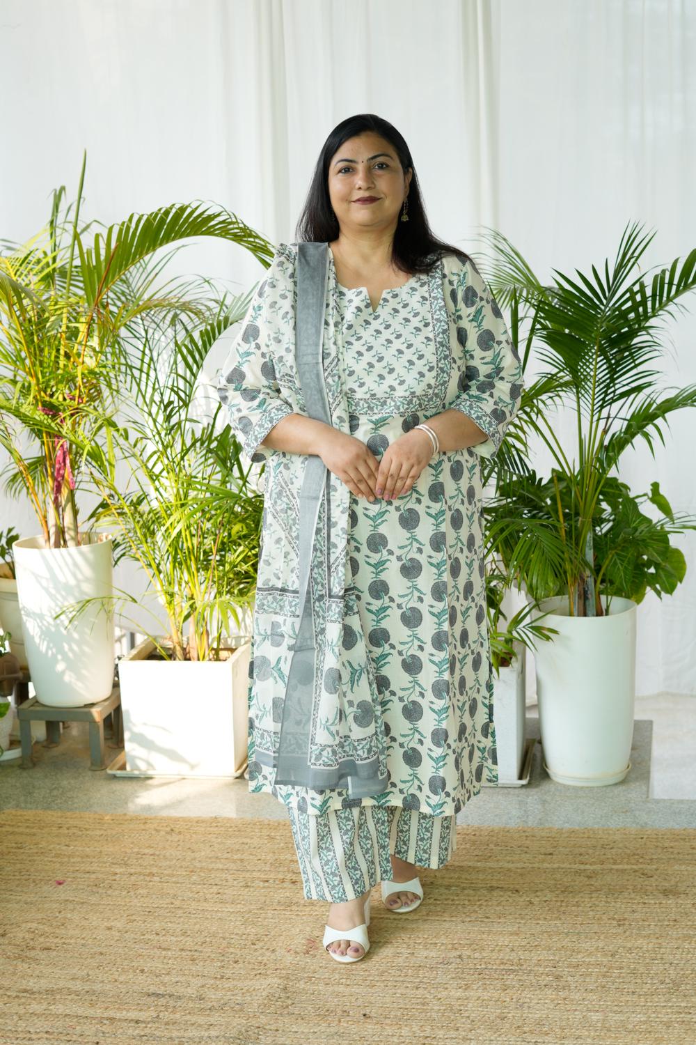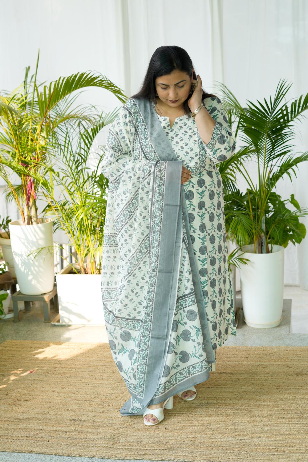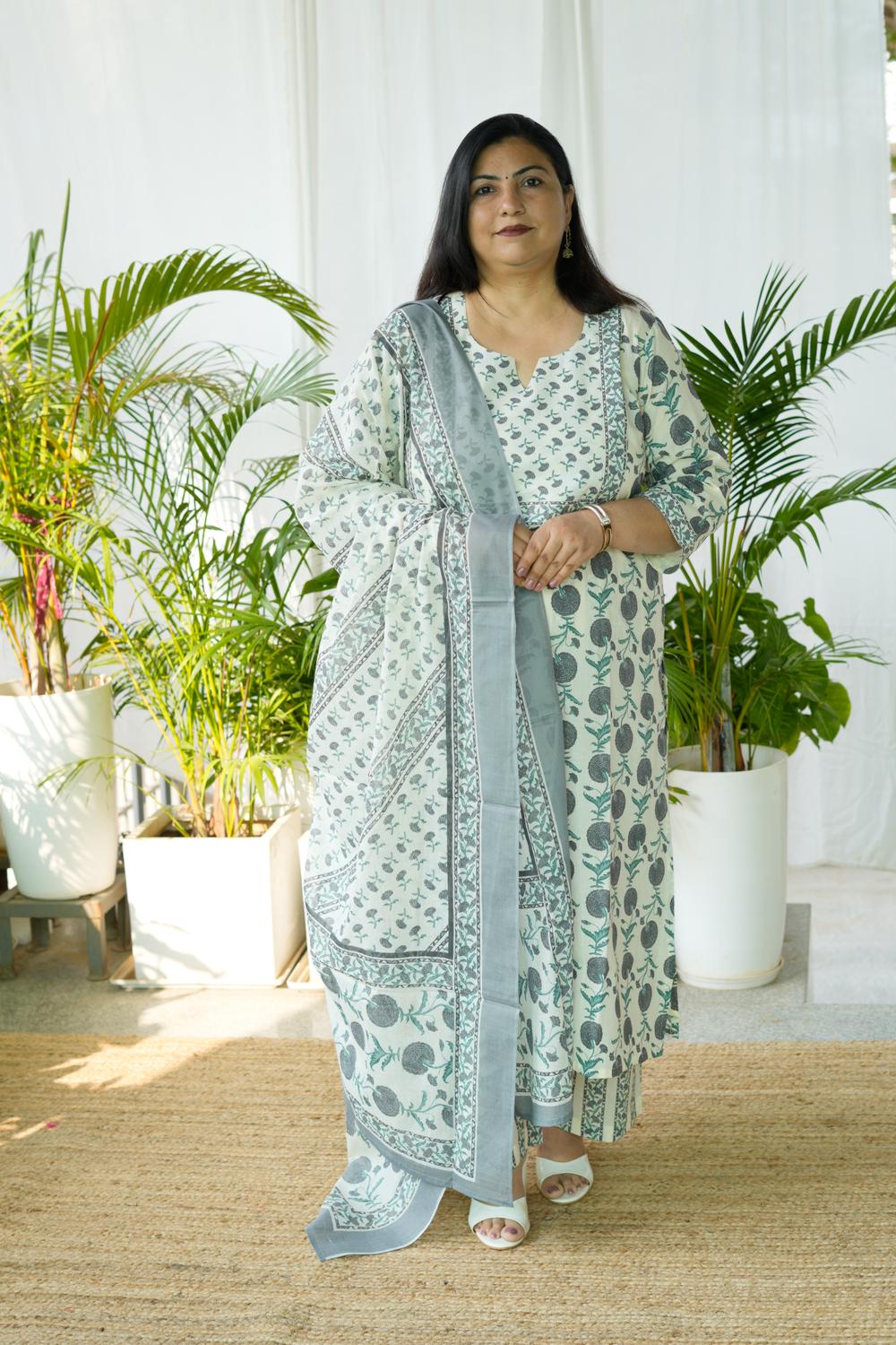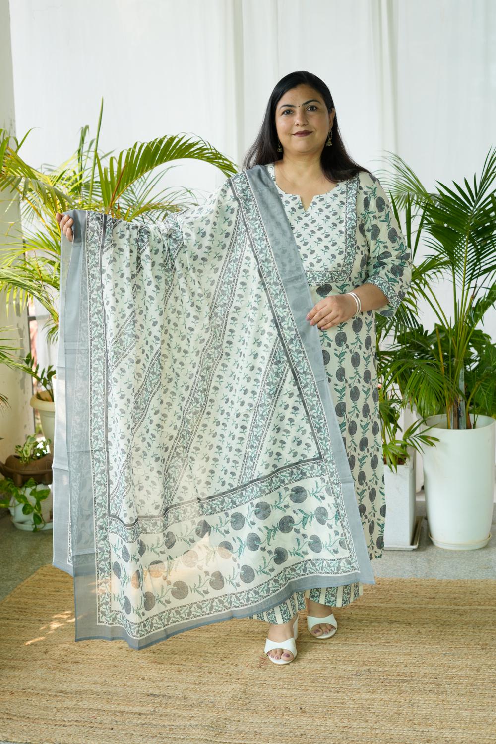 Feel confident, comfortable, and effortlessly elegant in our Grey Sanganeri Butta 3Pcs Set, designed specially for plus-size women (S-36 to 15XL).
