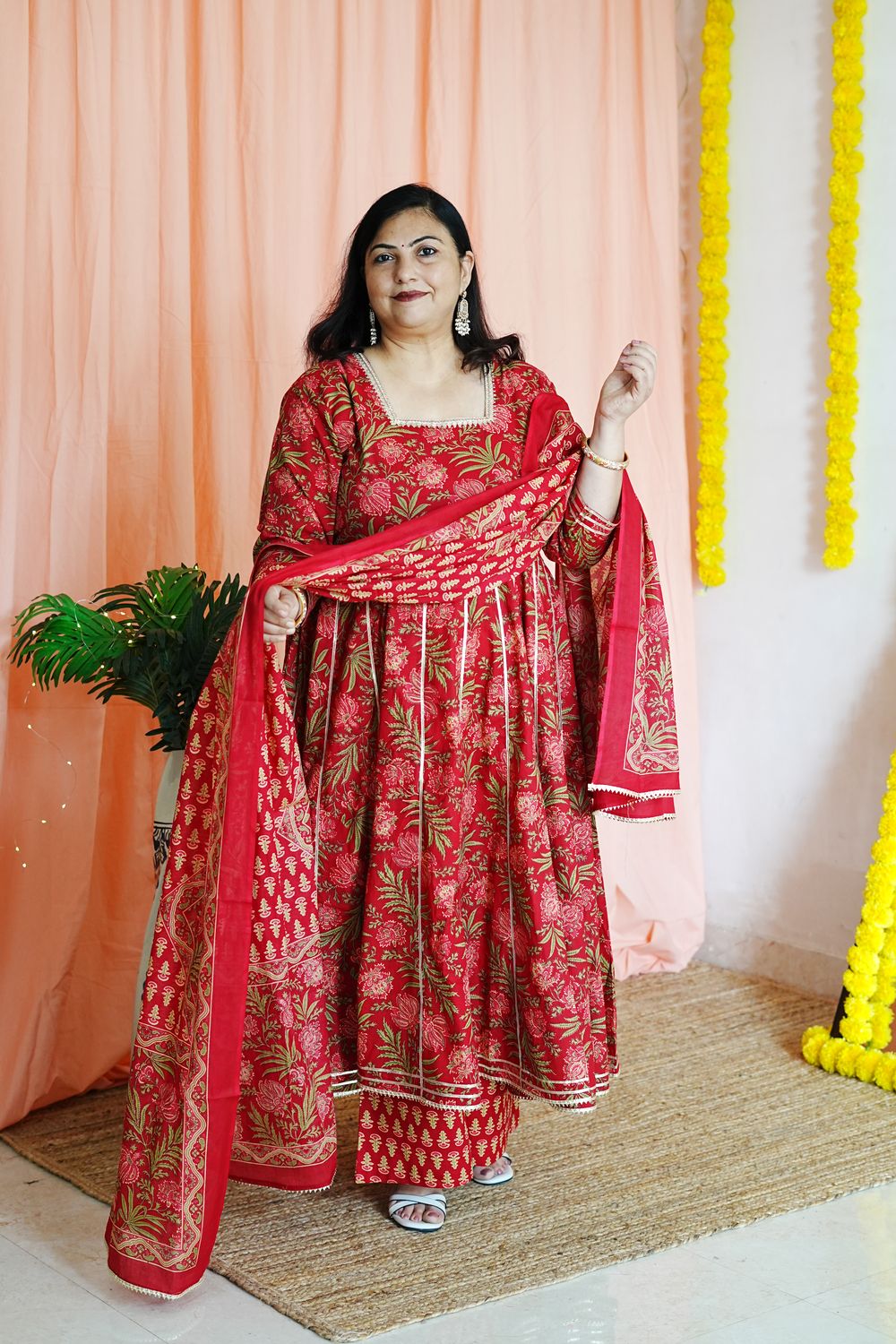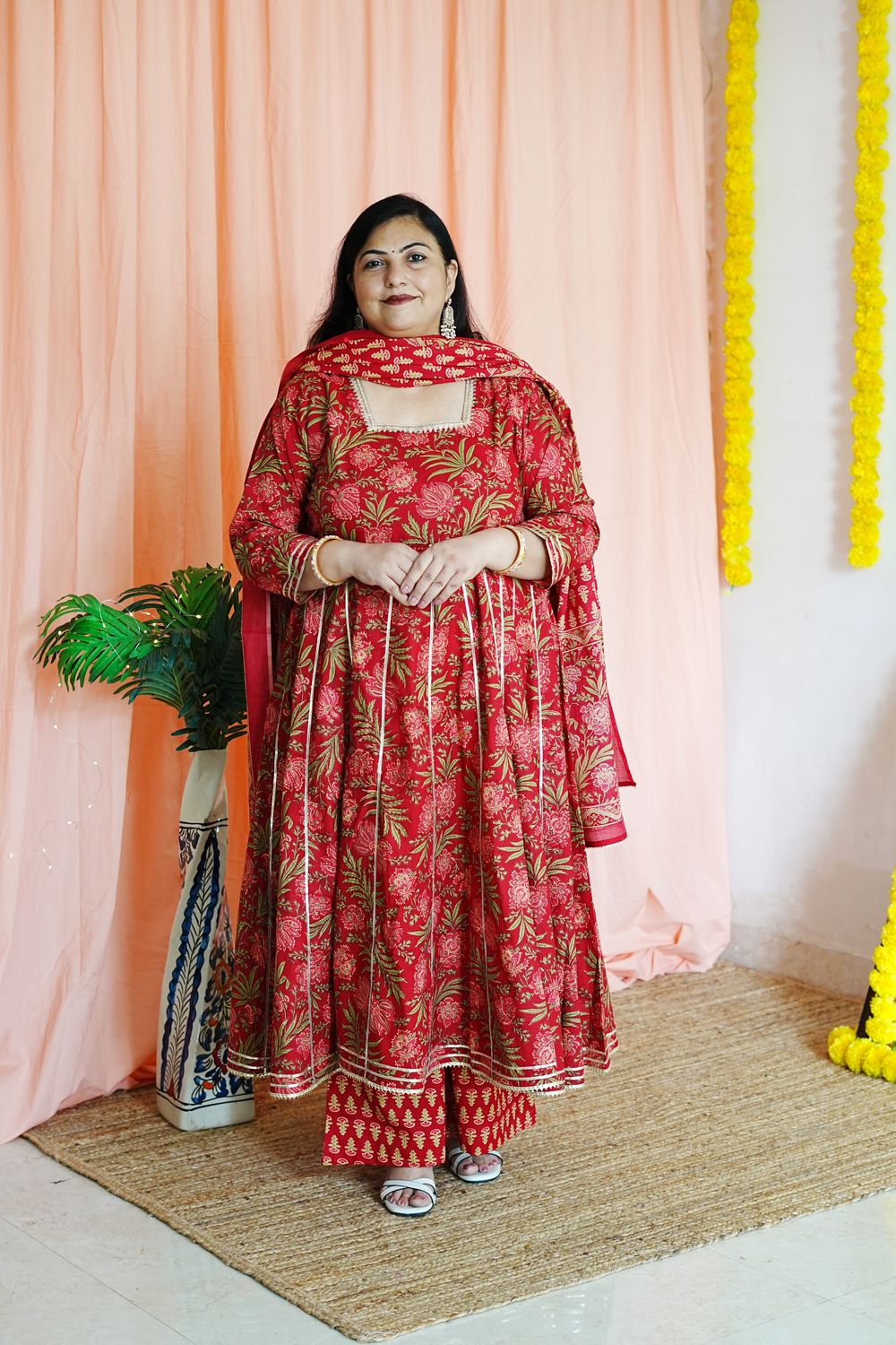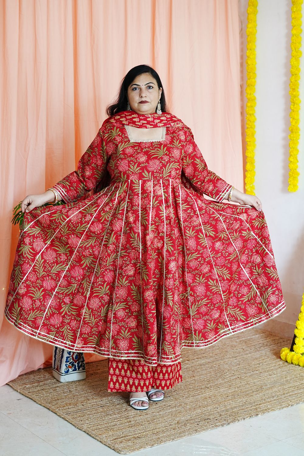 Step into timeless elegance with our Priya Red Plus Size Anarkali, a celebration of traditional Jaipuri craftsmanship and modern plus-size tailoring.