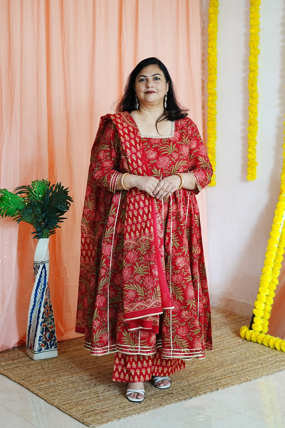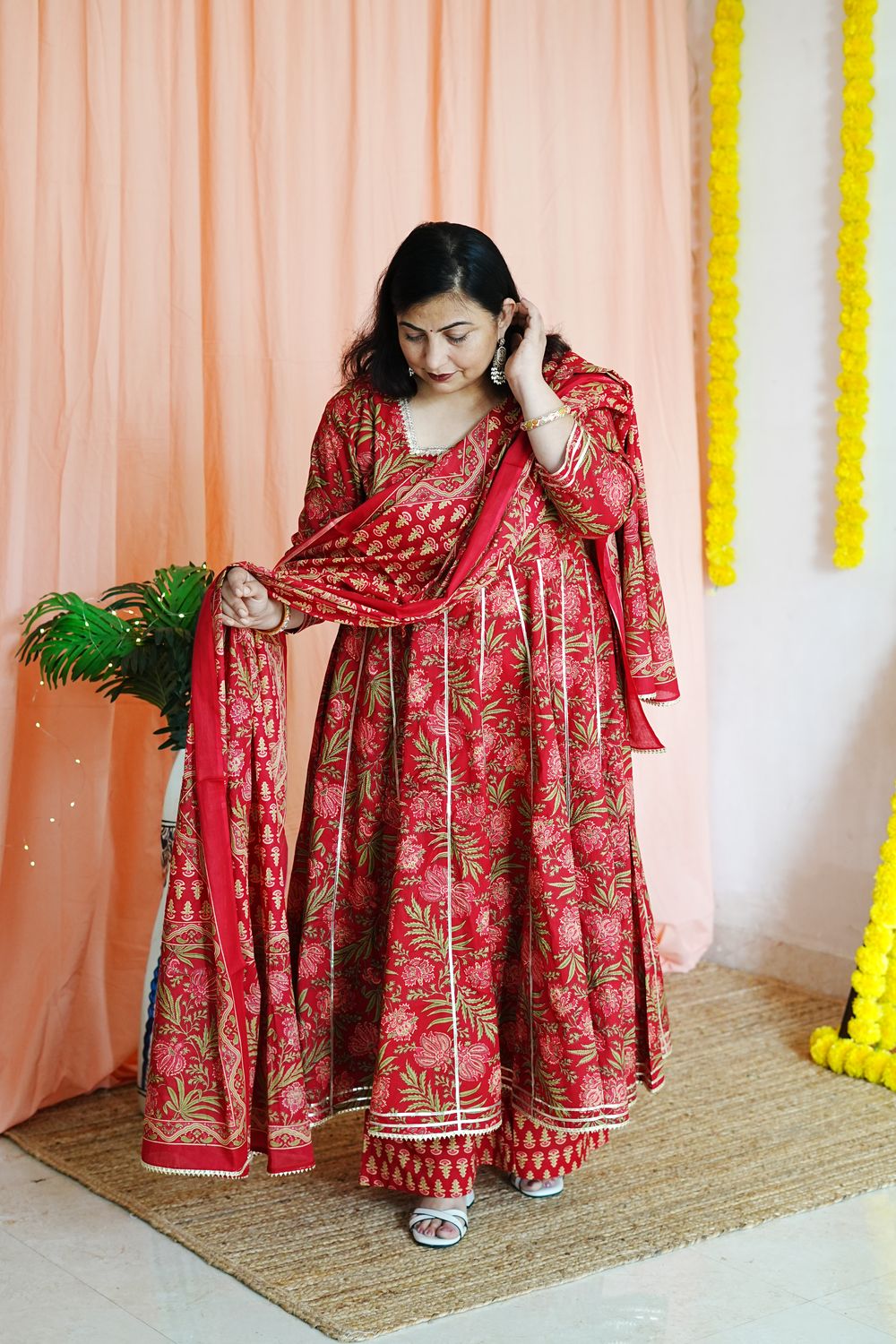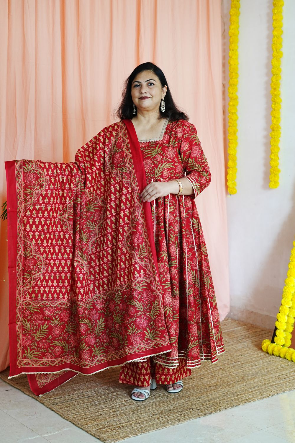 Step into timeless elegance with our Priya Red Plus Size Anarkali, a celebration of traditional Jaipuri craftsmanship and modern plus-size tailoring.
