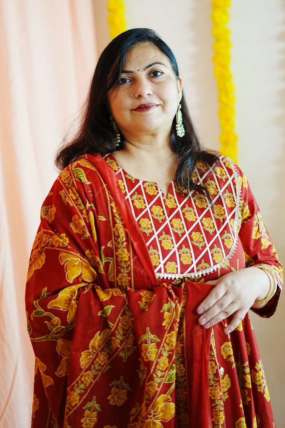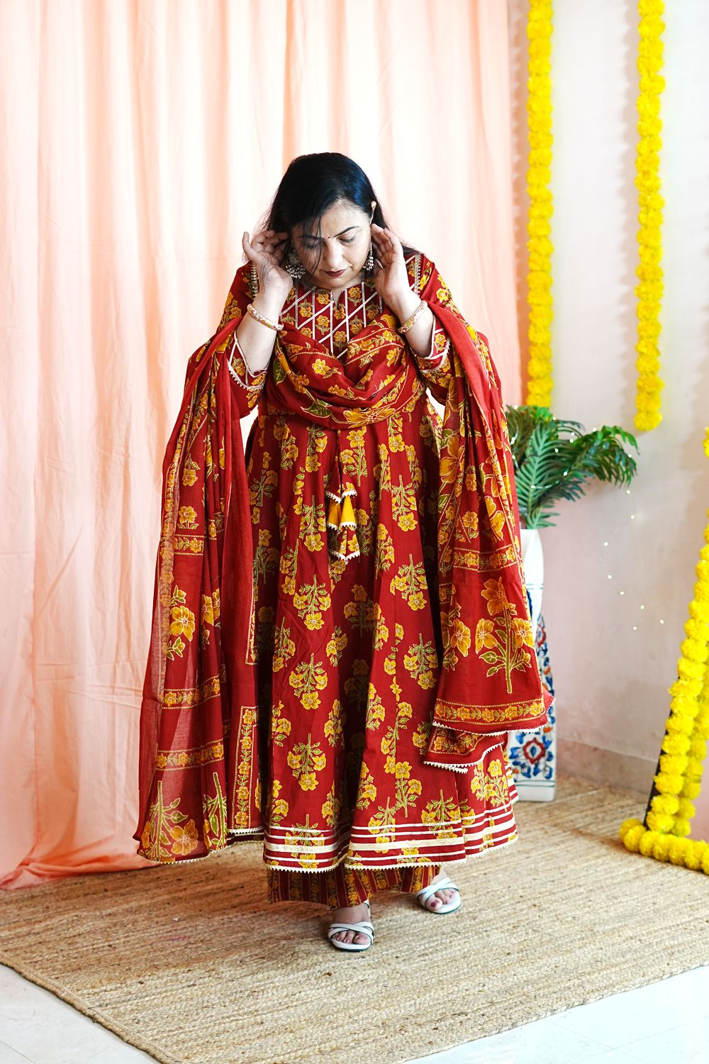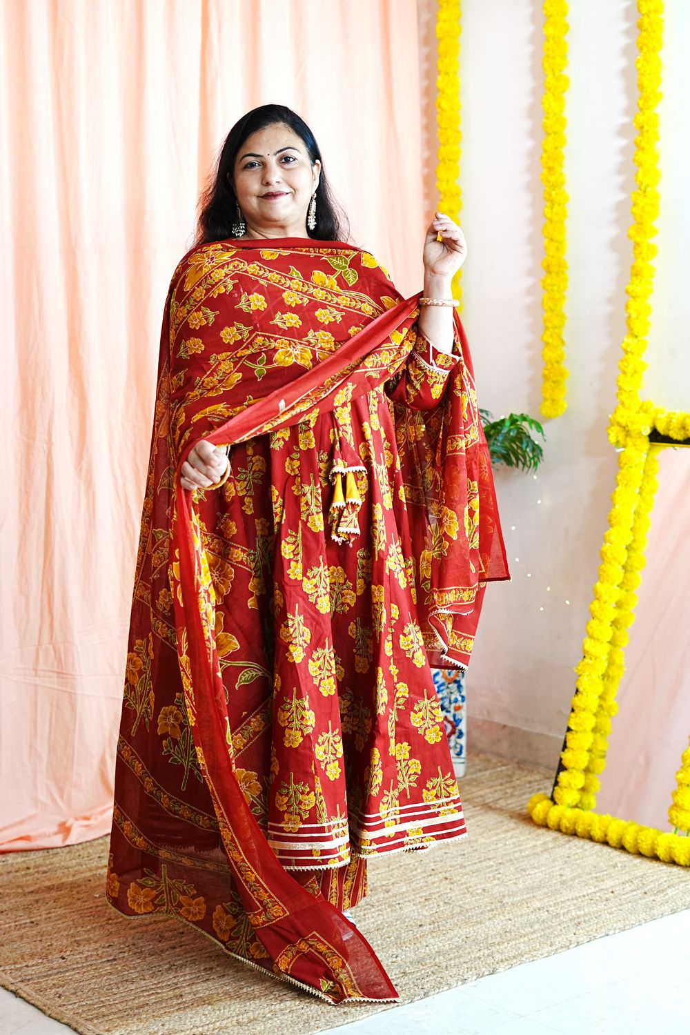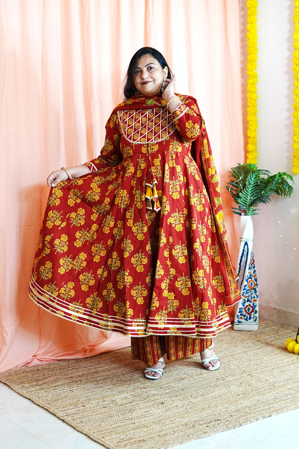 Step into timeless elegance with our Rust Floral Plus Size Anarkali a celebration of traditional Jaipuri craftsmanship and modern plus-size tailoring.